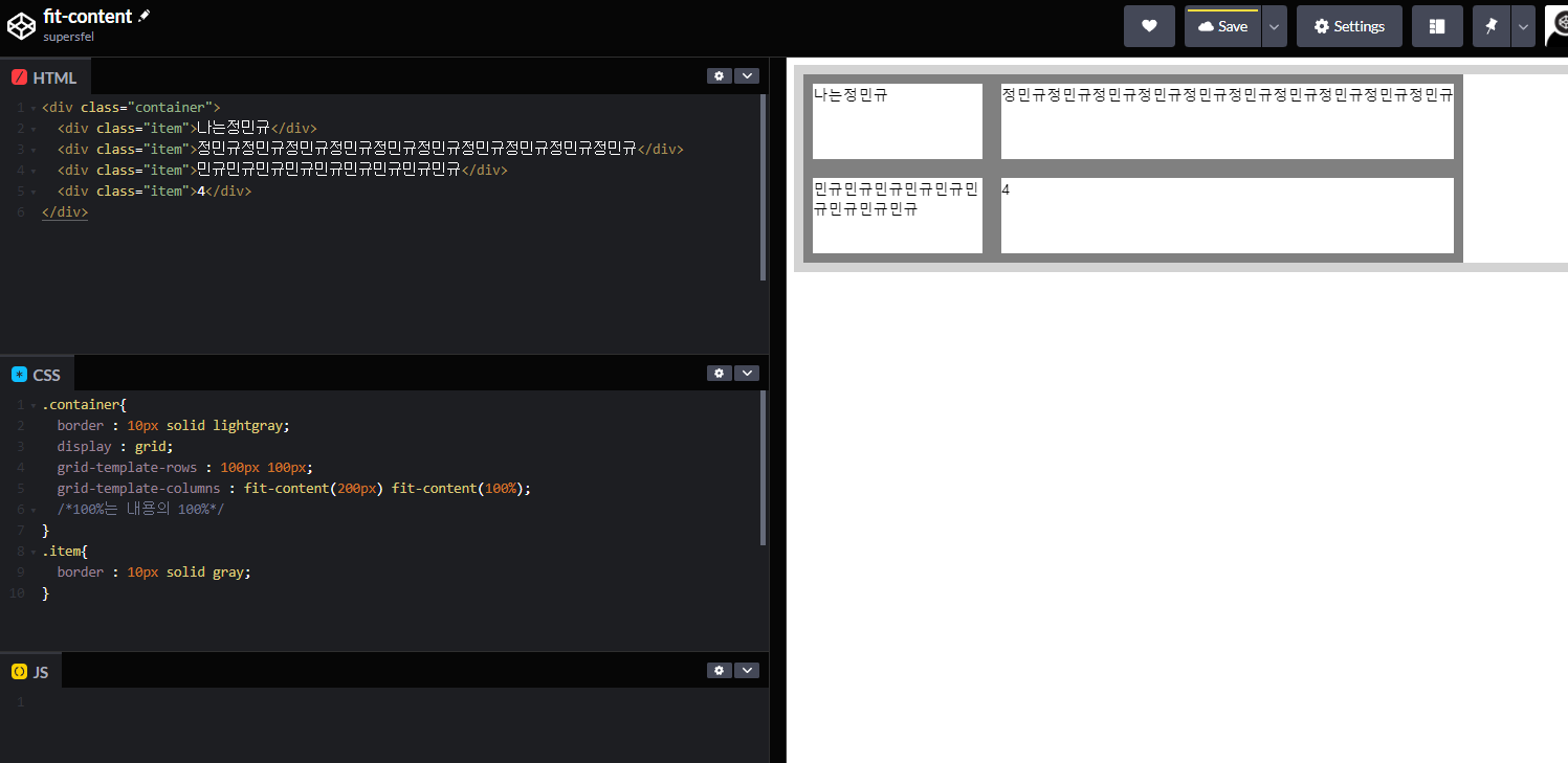fit-content(300px) 와 같이 쓸 경우, 그리드 아이템에 맞춰지긴 하지만, 300px를 넘지 못하게 설정할 수 있다.